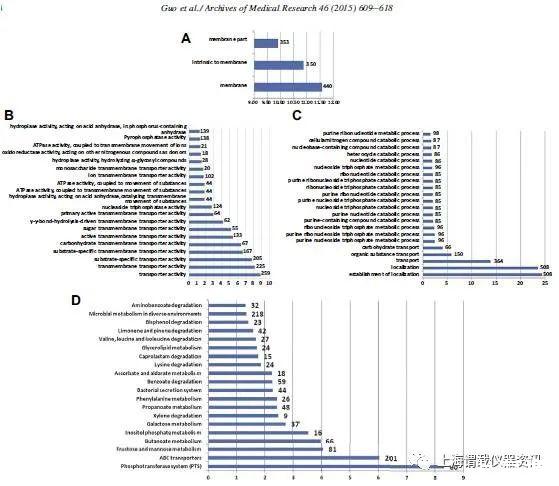 圖3、圖(A)表示的是肺炎克雷伯菌株菌株的相關成分分析。圖B和圖C表示的集群過程本體。圖D表示的是KEGG通路分析。在圖A、B、C、D中,注釋軸按功能項進行分類。這些列表展示的是所有菌株中帶注釋基因的數(shù)量。