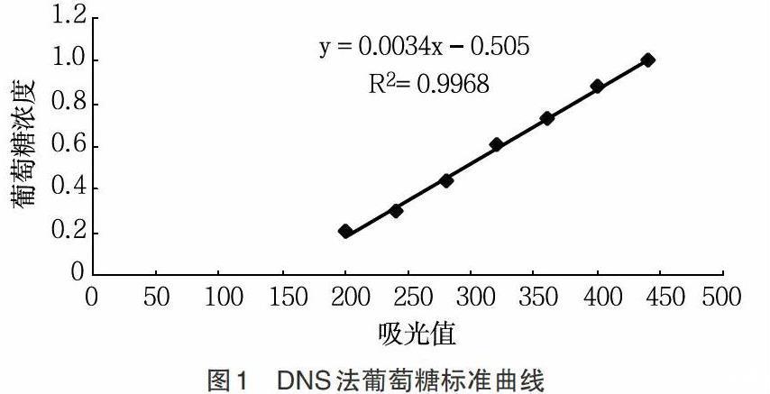參照1.2.1所描述的方法制備出標(biāo)準(zhǔn)葡萄糖曲線(圖1),根據(jù)標(biāo)準(zhǔn)葡萄糖曲線求出直線回歸方程y=0.003 4x-0.505,R2=0.996 8(y:葡萄糖濃度,x:OD530的值),通過直線回歸方程可以計(jì)算纖維素酶酶促反應(yīng)中產(chǎn)生葡萄糖的濃度,從而根據(jù)酶活力單位定義算出酶活。