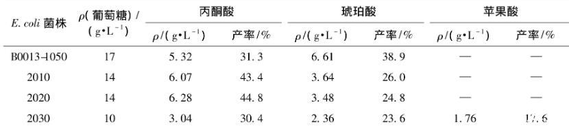 對重組菌E.coli 2010、2020和2030進行搖瓶發(fā)酵試驗,以出發(fā)菌E.coli B0013-1050作為對照,發(fā)酵結(jié)果見表2。由表2可知:敲除基因fumB的重組菌E.coli 2010厭氧發(fā)酵的主要產(chǎn)物是丙酮酸和琥珀酸,和出發(fā)菌相比較,琥珀酸的產(chǎn)量下降,葡萄糖-琥珀酸轉(zhuǎn)化率由出發(fā)菌的38.9%下降為26%。而繼續(xù)敲除fumC基因的重組菌E.coli 2020的琥珀酸產(chǎn)量卻只有微弱的下降,并未到達預(yù)期中完全消除琥珀酸積累的目的。