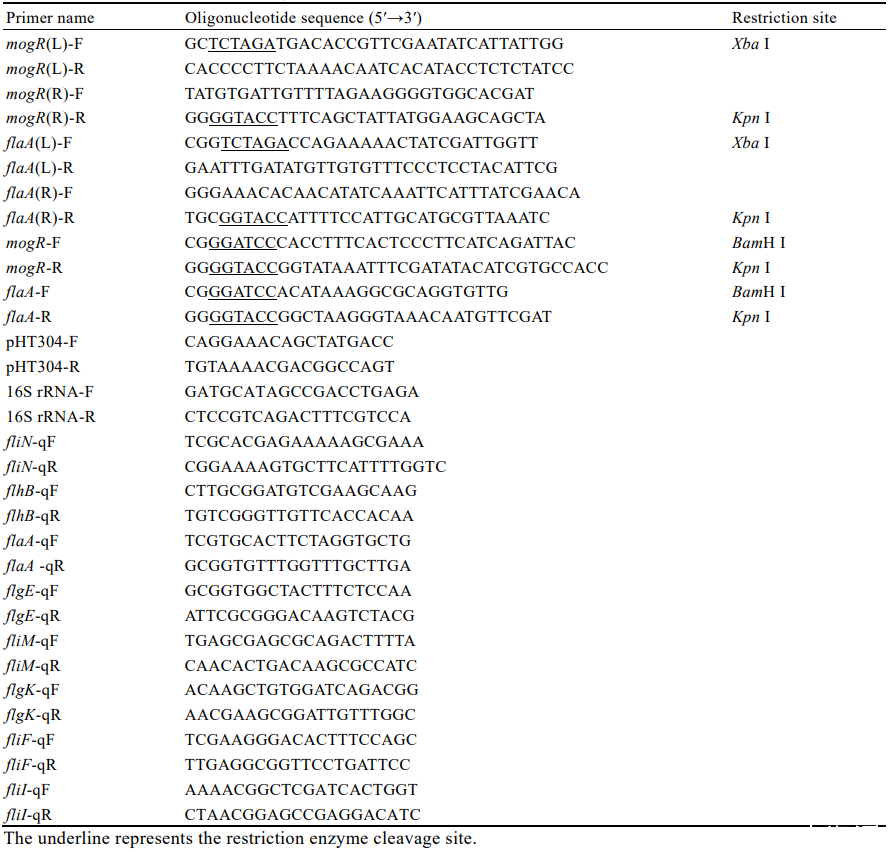 提取分別在4、28、37℃條件下培養(yǎng)至對(duì)數(shù)期的ATCC 19115、ΔmogR、ΔflaA、cΔmogR和cΔflaA菌體RNA,用反轉(zhuǎn)錄試劑盒進(jìn)行逆轉(zhuǎn)錄,獲得的產(chǎn)物cDNA即為RT-qPCR的模板。按照2×T5 Fast qPCR Mix(SYBR Green I)試劑說明書對(duì)鞭毛合成基因flaA、fliN、flhB、flgE、fliM、flgK、fliF和fliI及16S rRNA基因(作為內(nèi)參基因)進(jìn)行RT-qPCR。用2???Ct相對(duì)定量法對(duì)結(jié)果進(jìn)行表達(dá)差異性分析。
