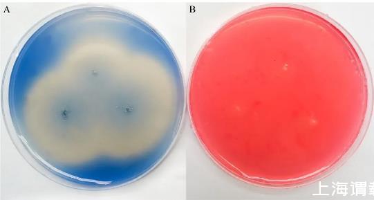 圖1菌株XKG6在不同培養(yǎng)基上的褪色情況A:苯胺藍褪色圈.B:剛果紅褪色圈