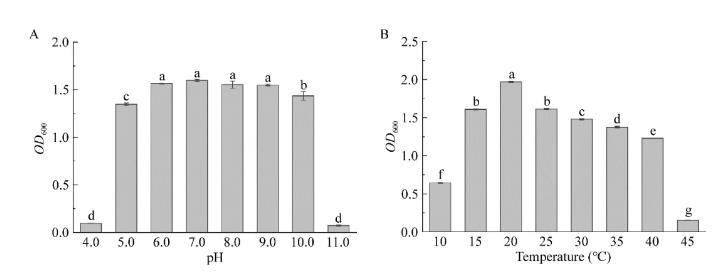圖2菌株XKG6生長的最適pH(A)和最適溫度(B)不同小寫字母表示處理間差異顯著(P<0.05)