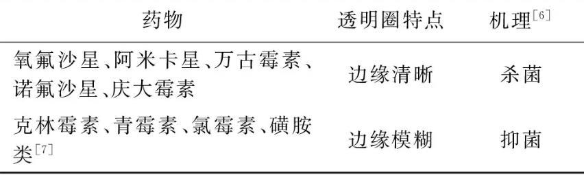 在藥敏試驗中,不同藥物形成不同的透明圈,有的透明圈邊緣整齊,有的透明圈邊緣模糊,沒有明顯的界限,見表1。