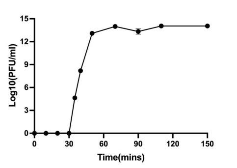 隨機(jī)挑取1個(gè)宿主菌Pa021單菌落,接種至LB液體培養(yǎng)基中,37℃搖床培養(yǎng)至對(duì)數(shù)早期;噬菌體與細(xì)菌按照MOI為0.01混合,室溫反應(yīng)8min,10000rpm離心30s,留沉淀;吸取3mL LB液體培養(yǎng)基吹打沉淀,室溫10000rpm離心30s,留沉淀后再次吹打;最后,用預(yù)熱的5mL LB液體培養(yǎng)基充分重懸;隨后在37℃、180rpm的恒溫?fù)u床中培養(yǎng);開始計(jì)時(shí),每隔5min取樣一次取至30min,然后每隔10min取樣一次,取5次至100min,取出的100μL樣品12000rpm離心2min后收集上清;所得濾液置于4℃冰箱中,100min后,將各個(gè)時(shí)間所得的濾液倍比稀釋,雙層瓊脂平板法測(cè)滴度,實(shí)驗(yàn)重復(fù)3次。得知:噬菌體Phage_Pae01的潛伏期為30min,裂解期為20~30min,隨后進(jìn)入平穩(wěn)期。