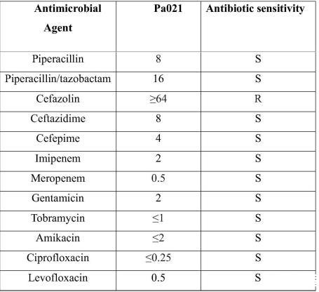 實(shí)驗(yàn)菌株是從江蘇省婦幼保健院污水處理中心分離獲得。取少量污水樣本涂布至血平板上,35℃培養(yǎng)過夜。次日,挑取單菌落,四區(qū)劃線至血平板上,直至菌落生長均一。于VITEK進(jìn)行細(xì)菌鑒定及藥敏試驗(yàn),確定為銅綠假單胞菌,將其命名為Pa021。銅綠假單胞菌Pa021藥敏結(jié)果見表1。銅綠假單胞菌Pa021菌落生長形態(tài)見圖1。