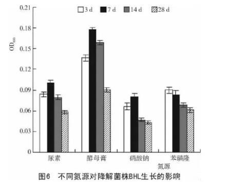 由圖6可知,降解菌株BHL在以尿素、酵母膏、硝酸鈉和苯磺隆分別為唯一氮源的培養(yǎng)基中均可以生長,生長情況視不同氮源而異(酵母膏>尿素>苯磺?。鞠跛徕c)。從圖6可以看出,以酵母膏為氮源時,降解菌株BHL的生長最好,OD600值明顯高于其他幾種氮源。苯磺隆作為唯一氮源時,菌株BHL可以生長,與以尿素、硝酸鈉為氮源時生長狀況差異不大。
