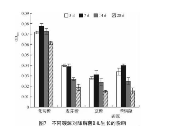 從圖7可以看出,以相同質(zhì)量濃度的葡萄糖、麥芽糖、蔗糖和苯磺隆分別為唯一碳源的培養(yǎng)基中,以葡萄糖為碳源時,降解菌株生長情況較其他碳源要好。在所選碳源的培養(yǎng)基中,降解菌株雖都能生長,但生長情況較差,OD600值都在0.1以下。
