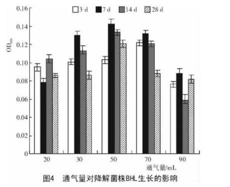 由圖4可知,在250 mL的三角瓶中裝入20~90 mL培養(yǎng)液后,菌株BHL均可以生長,但隨著培養(yǎng)基體積的增加,不同時間OD600呈先增加后減少的變化趨勢。當(dāng)裝液量為50 mL(1/5體積)時,降解菌株BHL的生長最好。