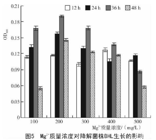 從圖5可以看出,降解菌株BHL在供試Mg2+質(zhì)量濃度范圍內(nèi)均可以生長。當(dāng)Mg2+質(zhì)量濃度為200 mg/L時,生長最佳。