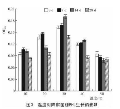從圖3可以看出,降解菌在所設(shè)的溫度條件下均可以生長。隨著溫度的升高,OD600呈先增加后減少的變化趨勢;當(dāng)溫度為30℃時,菌株長勢最好。
