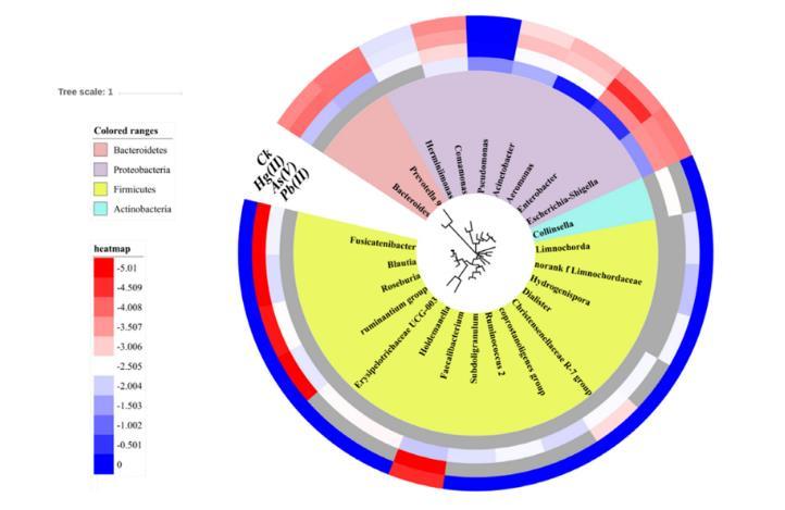 圖5、對(duì)Ck(不含重金屬對(duì)照)和不同重金屬脅迫條件下轉(zhuǎn)接合子池前25個(gè)屬的共軛電位進(jìn)行了分析。