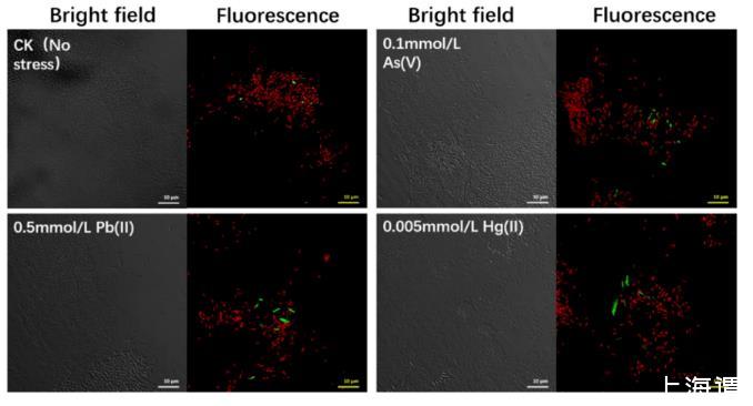 圖4、在不同的金屬脅迫條件下,通過(guò)共聚焦激光罐形顯微鏡(CLSM)觀(guān)察48h后ARG轉(zhuǎn)移到活性污泥菌的芯片上。紅點(diǎn)是供體細(xì)胞,綠點(diǎn)是轉(zhuǎn)接合子。