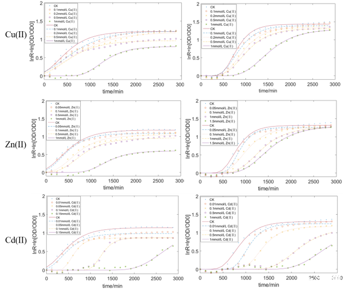 圖2、不同濃度Cu(II)、Zn(II)、Cd(II)、對(duì)大腸桿菌MG1655和活性污泥菌的劑量-響應(yīng)生長(zhǎng)抑制曲線(xiàn)。