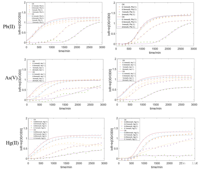 圖3、不同濃度Pb(II)、As(V)和Hg(II)對(duì)大腸桿菌MG1655和活性污泥菌的劑量-響應(yīng)生長(zhǎng)抑制曲線(xiàn)。