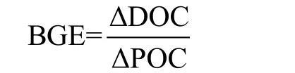 細(xì)菌生長(zhǎng)效率(Bacterial Growth Efficiency,BGE)反映了水生生態(tài)系統(tǒng)中溶解有機(jī)碳通過異養(yǎng)細(xì)菌二次生產(chǎn)轉(zhuǎn)化為自身顆粒有機(jī)物的效率,定義為: