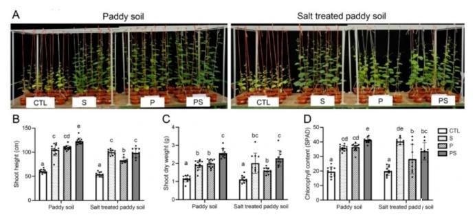 圖3、聯(lián)合體促進植物生長并緩解鹽脅迫。(A)照片顯示了在普通稻田土壤或鹽處理稻田土壤中種植的6周齡黃瓜植株,接種了S(B.velezensis SQR9)、P(P.stutzeri XL272)或PS(P和S的混合物)。CTL代表在沒有接種細菌的普通土壤中生長的植物。(B)植物的拍攝高度。(C)枝條干重。(D)植物的葉綠素含量。