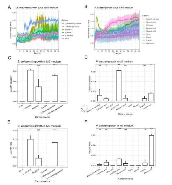 圖5、單個微生物的生長動力學。(A和B)在M9培養(yǎng)基中以相應化合物作為唯一碳源對芽孢桿菌SQR9和施氏假單胞菌XL272的生長曲線進行研究。(C&D)生長能力是最大的種群規(guī)模。該值為最大OD600值減去初始OD600值。(E&F)增長率是指數(shù)階段生長曲線的斜率。給出的數(shù)據(jù)為平均值±標準差(n=5)。誤差條代表標準偏差。