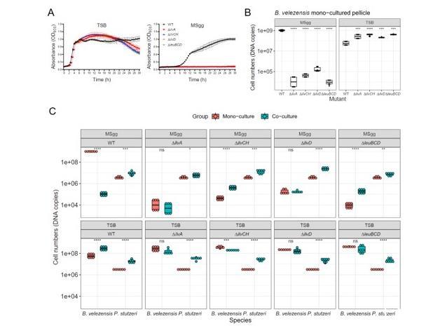 圖4、合成BCAA的能力是貝氏芽孢桿菌SQR9在最小培養(yǎng)基中生存的必要條件,但在豐富培養(yǎng)基中是必不可少的。(A)B.vele zensisBCAAs生物合成突變體的生長曲線(B)芽孢桿菌zensisBCAAs生物合成突變體在單培養(yǎng)膜中的細胞數(shù)量。星號表示與野生型相比具有統(tǒng)計學意義(p<0.01)。(C)雙種生物膜細胞數(shù),上標題為中型,下標題為芽孢桿菌突變體。