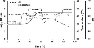 圖5、在周期性變化的溫度(37°C下24小時、42°C下12小時和45°C下24小時)下儲存的淡奶中觀察到的(點)和預(yù)測的(線)嗜熱脂肪芽孢桿菌ATCC 7953生長的比較。不連續(xù)的線表示牛奶的pH值(---)和溫度變化(------)。