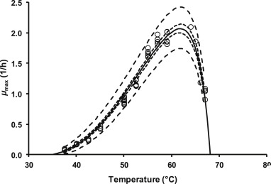 圖1、溫度對嗜熱脂肪地芽孢桿菌ATCC 7953在胰蛋白胨大豆肉湯中的最大比生長速率(μmax)的影響,符合帶有拐點的基數(shù)模型(實線)(等式(1))。點(○)表示μmax的觀測值。虛線和不連續(xù)線分別描繪了溫度對最大比生長速率影響的95%置信度和預(yù)測限值。