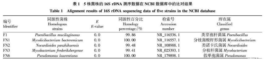 使用Ashby無(wú)氮培養(yǎng)基,從連作的番茄根際土中分離篩選到5株菌株,編號(hào)為F1、FN1、FN2、FN3和FN6。使用16S rDNA方法對(duì)5株菌株進(jìn)行分子生物學(xué)鑒定。結(jié)果顯示,F(xiàn)1、FN1、FN2、FN3和FN6分別與菌株P(guān)aenibacillus mucilaginosus、Mycolicibacterium smegmatis、Nocardioides panacihumi、Mycobacterium asiaticum和Pseudomonas laurentiana具有高度同源性,同源性百分比均大于99%(表1)。5株菌株F1、FN1、FN2、FN3和FN6分別屬于類芽孢桿菌屬(Paenibacillus),分枝菌酸桿形菌屬(Mycolicibacterium),類諾卡氏菌屬(Nocardioides),分枝桿菌屬(Mycobacterium),假單孢菌屬(Pseudomonas)。