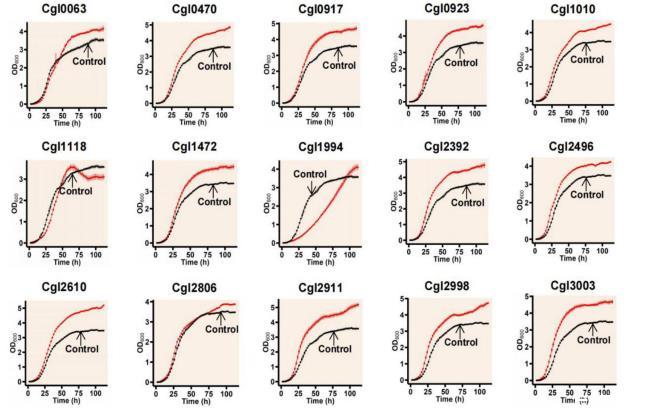 所有基因均顯示了30h至終點(diǎn)生長(zhǎng)過(guò)程連續(xù)15個(gè)最大值的平均值,其中最上面的深色點(diǎn)是15個(gè)值均提高20%以上的基因,下面的深色點(diǎn)代表15個(gè)值均降低20%以上的基因。生長(zhǎng)提高的基因一共29個(gè),包括以下基因cgl0011、cgl0063、cgl0470、cgl0487、cgl0489、cgl0490、cgl0893、cgl0917、cgl0923、cgl1010、cgl1118、cgl1367、cgl1472、cgl1532、cgl1541、cgl1605、cgl1653、cgl1941、cgl1994、cgl2392、cgl2496、cgl2610、cgl2735、cgl2806、cgl2937、cgl2911、cgl2998、cgl3003、cgl3098。