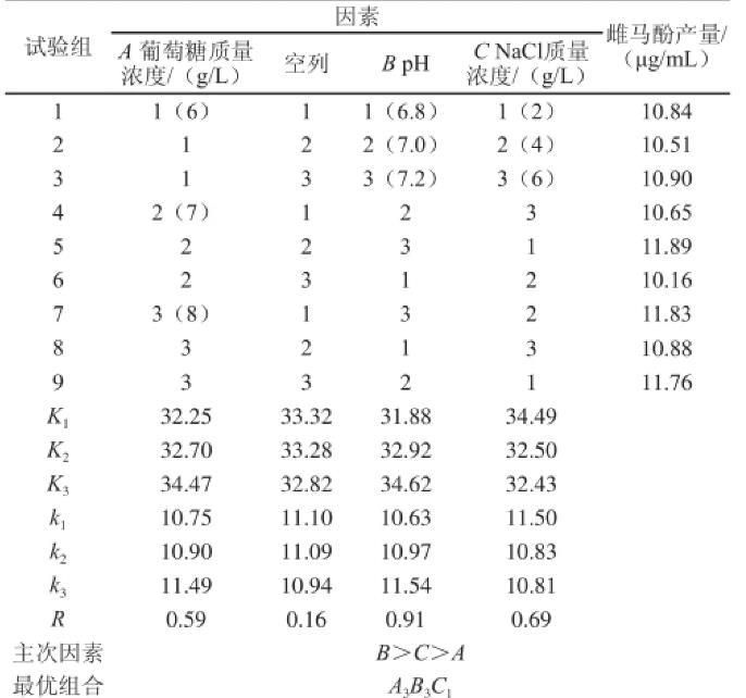 由表1可知,根據(jù)極差計(jì)算得到因素主次順序?yàn)椋築>C>A,即pH值>NaCl質(zhì)量濃度>葡萄糖質(zhì)量濃度。計(jì)算分析因素水平優(yōu)組合為A3B3C1,不同于正交試驗(yàn)中指標(biāo)最高的第5組A2B3C1,經(jīng)驗(yàn)證實(shí)驗(yàn)兩組結(jié)果分別為11.52μg/mL與11.89μg/mL,顯著差異(P<0.05),具有統(tǒng)計(jì)學(xué)意義,確定優(yōu)組合為A2B3C1,即葡萄糖質(zhì)量濃度7 g/L、pH 7.2、NaCl質(zhì)量濃度2 g/L。