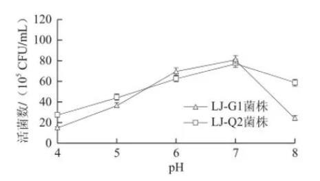 在葡萄糖質(zhì)量濃度為7 g/L、pH值為7時(shí),改變滲透壓(NaCl質(zhì)量濃度)分別為2、4、6、8、10 g/L,考察滲透壓對(duì)腸道菌生長(zhǎng)的影響,結(jié)果見圖7。LJ-G1和LJ-Q2活菌數(shù)隨NaCl質(zhì)量濃度的升高而增大,NaCl質(zhì)量濃度為4 g/L時(shí)達(dá)到最大,超過4 g/L之后活菌數(shù)明顯呈下降趨勢(shì),且下降幅度較大。原因是隨NaCl質(zhì)量濃度的繼續(xù)增高,會(huì)提高環(huán)境的滲透壓從而使菌不能繼續(xù)生長(zhǎng),由此可知NaCl適宜質(zhì)量濃度為4 g/L左右。