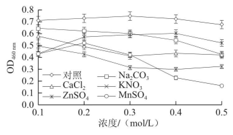 由圖2可知,5種金屬鹽的不同濃度對(duì)LJ-G1菌生長(zhǎng)均有不同程度的影響,運(yùn)用F檢驗(yàn)的方法,對(duì)各種差異進(jìn)行統(tǒng)計(jì)學(xué)分析得知:Na2CO3濃度在0.3 mol/L之前與對(duì)照組比其影響無顯著差異(P>0.05),不具有統(tǒng)計(jì)學(xué)意義,但0.5 mol/L與0.3 mol/L相比呈明顯的抑制作用(P<0.05);CaCl2濃度0.1 mol/L與0.5 mol/L相比差異顯著(P<0.05),濃度愈大抑制作用愈強(qiáng),具有統(tǒng)計(jì)學(xué)意義;KNO3這5個(gè)濃度的影響比較一致;ZnSO4濃度為0.3 mol/L時(shí)抑制作用最小,0.3 mol/L分別與0.1 mol/L和0.5 mol/L相比差異顯著(P<0.05),具有統(tǒng)計(jì)學(xué)意義;MnSO4濃度為0.1 mol/L時(shí)抑制作用相對(duì)較小,與0.5 mol/L相比差異顯著(P<0.05),具有統(tǒng)計(jì)學(xué)意義。由圖2還可知,與對(duì)照組比較,5種金屬鹽對(duì)LJ-G1菌生長(zhǎng)的抑制作用由弱到強(qiáng)依次為Na2CO3<CaCl2<KNO3<ZnSO4<MnSO4。