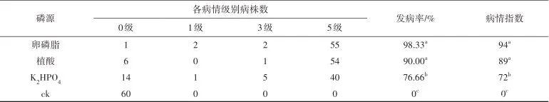 表5不同磷源培養(yǎng)的禾谷鐮刀菌菌絲的致病力