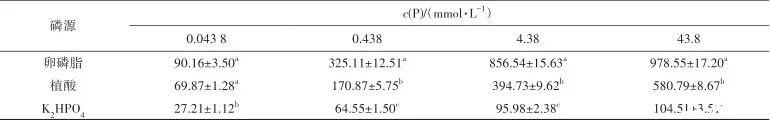 在液體搖床培養(yǎng)試驗(yàn)中,禾谷鐮刀菌在卵磷脂、植酸和K2HPO4為唯一磷源的液體培養(yǎng)基中培養(yǎng)7 d后,菌絲生物量的測定結(jié)果見表2。不同磷源物質(zhì)對(duì)禾谷鐮刀菌菌絲生物量的影響差別很大。以卵磷脂為唯一磷源,菌絲生物量顯著高于對(duì)照組K2HPO4,說明卵磷脂更有利于禾谷鐮刀菌生長,磷濃度為4.38 mmol/L時(shí),卵磷脂菌絲生物量達(dá)到0.28 g,而同一磷濃度下K2HPO4組生物量為0.22 g,植酸組生物量為0.23 g。植酸與K2HPO4相比,對(duì)禾谷鐮刀菌菌絲體生長促進(jìn)效果不顯著,說明植酸與無機(jī)磷酸根離子對(duì)禾谷鐮刀菌生長的有效性相同。同一磷源物質(zhì),濃度不同對(duì)菌絲生物量也有很大影響。當(dāng)磷濃度為0.043 8 mmol/L時(shí),卵磷脂菌絲生物量為0.13 g,當(dāng)磷濃度為4.38 mmol/L時(shí),菌絲生物量可達(dá)到0.28 g,菌絲生物量增加了1.2倍。