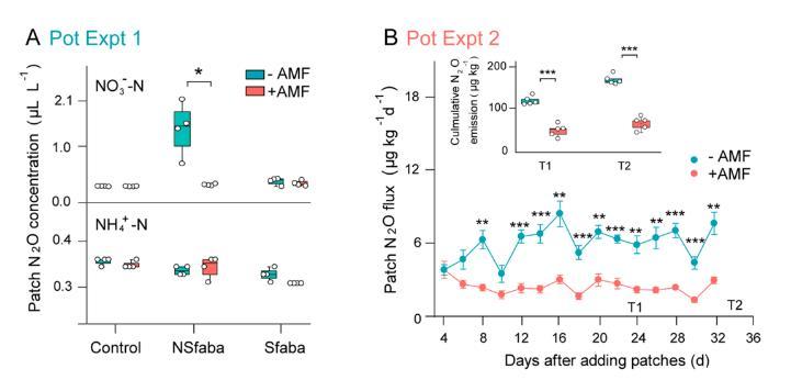 圖2:在沒(méi)有AMF(-AMF)或有AMF(+AMF)的情況下,斑塊的N2O排放。