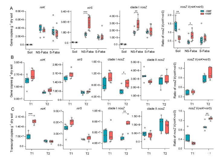 圖3:在沒(méi)有或存在AMF的情況下,nirK,nirS,nosZ(I族和II族)的基因和轉(zhuǎn)錄拷貝,以及在沒(méi)有或有AMF的情況下的nosZ I/(nirK+nirS)比例