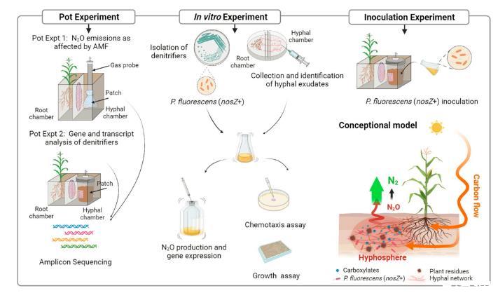 該研究包括幾個(gè)實(shí)驗(yàn):兩個(gè)盆栽實(shí)驗(yàn),體外實(shí)驗(yàn)和一個(gè)接種實(shí)驗(yàn)。兩個(gè)盆栽實(shí)驗(yàn)(盆栽實(shí)驗(yàn)1和2)測(cè)試了AMF向殘留物微位點(diǎn)的增殖是否可以減少N2O排放并分解調(diào)節(jié)途徑。我們還測(cè)試了菌絲層中微生物組的豐度;體外實(shí)驗(yàn)評(píng)估熒光假單胞菌與AMF共定植對(duì)降低N2O的重要性排放。我們分離了反硝化劑,并確定了菌絲滲出物的關(guān)鍵成分。然后我們檢查了趨化性,生長(zhǎng),N2O在體外培養(yǎng)條件下響應(yīng)AMF滲出物和關(guān)鍵化合物的熒光假單胞菌的發(fā)射和反硝化基因表達(dá);最后,接種實(shí)驗(yàn)驗(yàn)證了AMF或AMF滲出的檸檬酸鹽對(duì)N2O的影響熒光假單胞菌在盆栽中的發(fā)射和nosZ基因表達(dá)。使用概念模型來(lái)說(shuō)明AMF與熒光假單胞菌相互作用以減輕N2O的途徑生產(chǎn)。