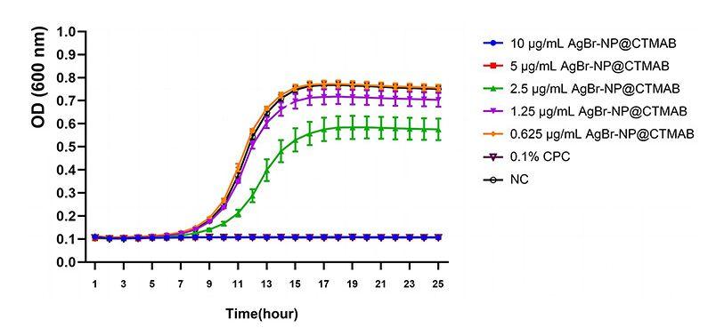 將200μL 1×106 CFU/mL的細(xì)菌加入到自動(dòng)生長(zhǎng)曲線分析儀的平板中,設(shè)3個(gè)平行孔。使用Bioscreen全自動(dòng)生長(zhǎng)曲線分析儀監(jiān)測(cè)變形鏈球菌在37°C和持續(xù)中速搖動(dòng)下24小時(shí)培養(yǎng)期內(nèi)的動(dòng)態(tài)發(fā)育。每隔1小時(shí)測(cè)定OD600nm值,以變形鏈球菌的OD值為縱坐標(biāo),以培養(yǎng)時(shí)間為橫坐標(biāo),繪制生長(zhǎng)曲線。這種系統(tǒng)方法確保了在特定實(shí)驗(yàn)條件下精確跟蹤和記錄變形鏈球菌的生長(zhǎng)動(dòng)態(tài)。根據(jù)CLSI(臨床和實(shí)驗(yàn)室標(biāo)準(zhǔn)研究所)標(biāo)準(zhǔn)化標(biāo)準(zhǔn),將測(cè)試濃度的AgBr-NP CTMAB溶液施用到含有106 CFU/mL變形鏈球菌的平板上。這些濃度為10μg/mL、5μg/mL、2.5μg/mL、1.25μg/mL和0.625μg/mL。將溶液在37°C有氧條件下孵育24小時(shí)。每組一式三份。實(shí)驗(yàn)重復(fù)三次。使用Bioscreen自動(dòng)生長(zhǎng)曲線分析儀捕獲變形鏈球菌的動(dòng)態(tài)生長(zhǎng)以及生長(zhǎng)曲線。