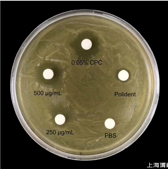 圖2、AgBr-NP CTMAB對(duì)變形鏈球菌的抑制區(qū)域照片。在圖中,在陰性對(duì)照PBS組周圍沒有觀察到明顯的抑制圈,表明沒有顯著的抑制作用。然而,在用AgBr-NP CTMAB溶液處理的濾紙周圍觀察到明顯的抑制圈。500μg/mL AgBr-NP CTMAB濾紙可以達(dá)到與0.05%氯氰菊酯相似的抑制圈。