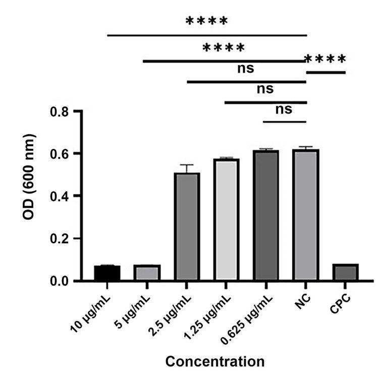 圖4、孵育24 h后各組溶液的濁度。將各組溶液轉(zhuǎn)移至離心管中并拍照,10μg/mL、5μg/mL AgBr-NP CTMAB溶液和CPC溶液組與NC組相比,濁度明顯降低。2.5μg/mL、1.25μg/mL、0.625μg/mL AgBr-NP CTMAB溶液與陰性對(duì)照組的濁度無顯著差異。