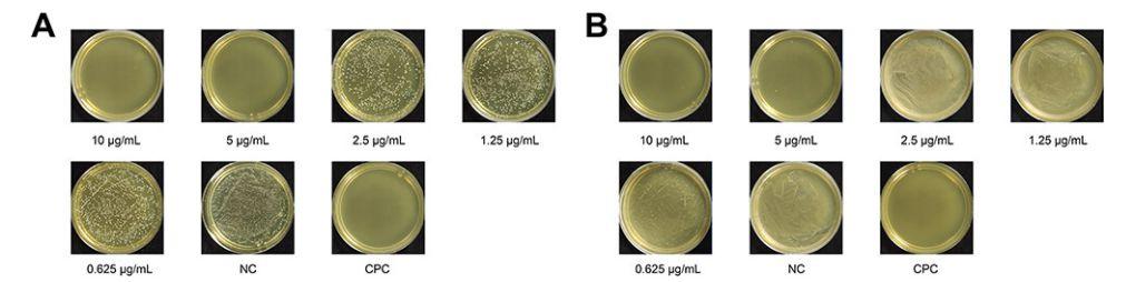 圖5、不同溶液組中BHI瓊脂平板培養(yǎng)48小時(shí)后的菌落生長(zhǎng)情況。(A)原始溶液涂覆板的結(jié)果。(B)稀釋10,0000倍后涂板的結(jié)果。與NC組相比,5μg/mL、10μg/mL AgBr-NP CTMAB和0.1%氯化十六烷基吡啶溶液組均未見菌落。相比之下,2.5μg/mL、1.25μg/mL和0.625μg/mL的AgBr-NP CTMAB溶液組顯示菌落遍布整個(gè)平板,且菌落生長(zhǎng)與NC組相似。5μg/mL、10μg/mL AgBr-NP CTMAB溶液和0.1%氯化十六烷基吡啶溶液組均未發(fā)現(xiàn)菌落生長(zhǎng)。相比之下,2.5μg/mL、1.25μg/mL、0.625μg/mL的AgBr-NP CTMAB溶液組,隨著濃度的降低,菌落數(shù)量由稀疏變得密集,表明AgBr-NP CTMAB溶液組的抑菌能力增強(qiáng)。