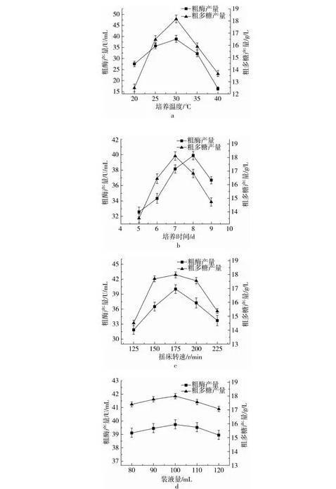 圖1培養(yǎng)溫度、培養(yǎng)時間、搖床轉(zhuǎn)速、裝液量對粗酶和多糖產(chǎn)量的影響