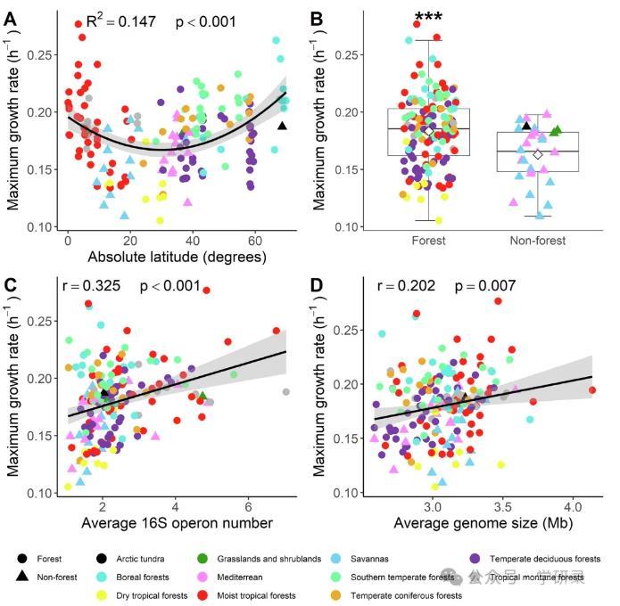 估計(jì)的最大生長(zhǎng)速率在生物群落中表現(xiàn)出顯著的變化,在熱帶和溫帶/北緯地區(qū)觀測(cè)到較高的最大生長(zhǎng)速率,而在干旱的亞熱帶地區(qū)觀測(cè)到較低的最大生長(zhǎng)速率(圖1A)。從緯度的角度分析,森林生物群落的最大生長(zhǎng)速率普遍較高(圖1B)。