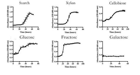 步驟4、利用常規(guī)細菌接種法進行生化試驗:將活化至對數(shù)生長中期的菌株以2%(v/v)的接種量接種于基本培養(yǎng)基MM中,分別以0.5%多糖(淀粉、葡聚糖、木聚糖、甘露聚糖、菊粉、地衣多糖、木葡聚糖)、0.5%二糖(纖維二糖、木二糖、甘露二糖)或0.5%單糖(葡萄糖、果糖、甘露糖、鼠李糖、半乳糖)作為唯一碳源底物,置于厭氧培養(yǎng)箱中于37℃條件下培養(yǎng);利用Bioscreen全自動微生物生長曲線測定儀連續(xù)測定80h,且每4h進行一次OD600值測定,繪制可代謝碳源底物譜和生長曲線,試驗重復(fù)3次;生長曲線如圖1所示,從圖中可以看出,以淀粉、木聚糖、纖維二糖、葡萄糖、果糖或半乳糖作為可代謝底物時有利于菌株生長。