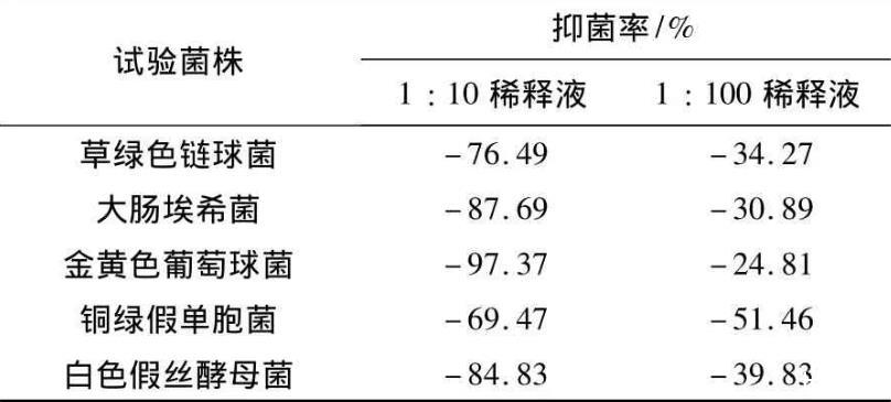 如表2所示,高濃度的煙草浸出液對草綠色鏈球菌、大腸埃希菌有明顯的抑制作用,而低濃度有明顯的促進(jìn)作用。不同濃度的煙草浸出液對金黃色葡萄球菌、銅綠假單胞菌均有不同程度的抑制作用,且與濃度無相關(guān)性。高濃度的煙草浸出液對白色假絲酵母菌有輕微促進(jìn)作用,低濃度對白色假絲酵母菌有明顯的促進(jìn)作用。