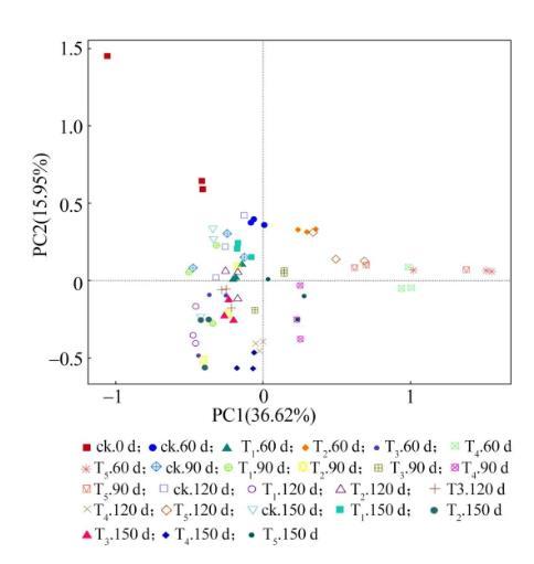 不同枝條添加量下土壤真菌的主坐標分析(PCoA),見圖5。前2個主坐標的貢獻率分別為36.62%和15.95%。處理60,90,150 d后,T1處理土壤樣品點與ck樣品點距離均較近,說明少量添加枝條對土壤真菌群落結(jié)構(gòu)影響較小。其他添加枝條處理均不同程度地改變了土壤真菌群落結(jié)構(gòu)。處理60 d后,T2,T4,T5樣品點比較接近,說明此時三者土壤真菌群落結(jié)構(gòu)相似度較高。處理90 d后,T3,T5樣品點距離拉近,說明此時二者土壤真菌群落結(jié)構(gòu)趨于相似。處理后期(120~150 d),T5處理樣品點遠離其他處理,說明T5處理明顯改變了土壤真菌群落結(jié)構(gòu),而此時T3,T4處理土壤真菌群落結(jié)構(gòu)相似度較高。