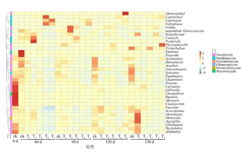 T2,T4,T5處理提高了60,90,120 d時小鬼傘屬(Coprinellus)的相對豐度。其中,T2處理還提高了60,90,150 d時小脆柄菇屬(Psathyrella)的相對豐度。不同枝條添加量處理主要降低了60,120,150 d時鏈格孢屬(Alternaria)、光黑殼屬(Preussia)、枝頂孢屬(Acremonium)、絲葚霉屬(Papulaspora)、新赤殼屬(Neocosmospora)、平臍蠕孢屬(Bipolaris)、毛殼屬(Chaetomium)、無莖真菌屬(Acaulium)、枝孢屬(Cladosporium)和間座殼屬(Diaporthe)的相對豐度。其中,T2處理降低了整個處理過程中葡萄穗霉屬(Stachybotrys)、Acrocalymma、鏈格孢屬(Alternaria)、Albifimbria、枝頂孢屬(Acremonium)、絲葚霉屬(Papulaspora)、新赤殼屬(Neocosmospora)、平臍蠕孢屬(Bipolaris)、毛殼屬(Chaetomium)、無莖真菌屬(Acaulium)、枝孢屬(Cladosporium)、Gibellulopsis、曲霉屬(Aspergillus)和間座殼屬(Diaporthe)的相對豐度(圖4)。