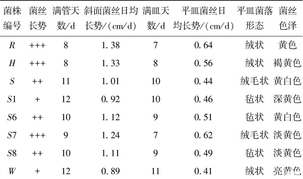 由圖1和表2可以看出,8個(gè)菌株中,R、H、S7的長勢(shì)最好,其次為S、S6和S8.長勢(shì)較好的菌株日平均生長速度較快,長勢(shì)弱的菌株生長速度較慢。不同菌株的菌落形態(tài)及菌絲顏色也有差異,H、W、S8、S1的菌絲顏色較深,且易產(chǎn)生色素,S7和S菌絲生長到后期表面會(huì)有油狀分泌物出現(xiàn),這些特征均是伴隨菌齡的增加而產(chǎn)生的。