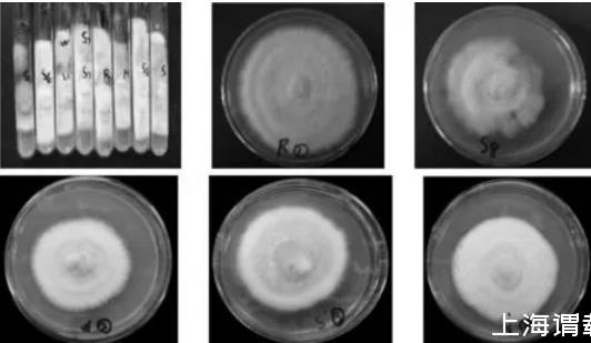 圖1 斜面和平皿培養(yǎng)基菌絲形態(tài)示例