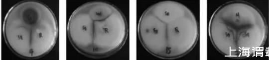 按照無菌操作的要求,將活化好的8種桑黃菌點(diǎn)接于平板培養(yǎng)基上,每個(gè)平板均勻接入3種菌株,每組合3個(gè)平行,28 ℃恒溫培養(yǎng)7——10 d,觀察菌絲間是否有拮抗現(xiàn)象發(fā)生,拮抗線是否明顯,并拍照記錄。根據(jù)拮抗線的寬度、顏色等特征,可以鑒別菌株的差異大小。