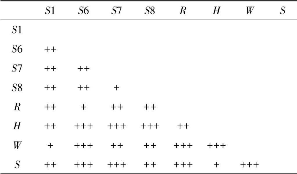 通過圖2和表3可以看出,S1與W;S6與R;S7與S8;H與S之間拮抗線不明顯,說明它們之間的親緣性較近;而S6與H、W、S;S7與H、S;S8與H;R與W、S;H與W;W與S之間拮抗線明顯,親緣性較遠(yuǎn)。
