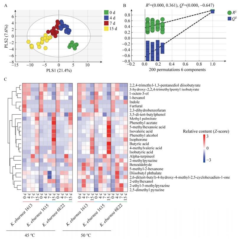 為找出不同發(fā)酵天數(shù)存在的特征差異化合物,分別對菌株K.eburnea 1613、K.eburnea 1615、K.eburnea 6E22發(fā)酵高粱揮發(fā)性物質(zhì)進行不同發(fā)酵天數(shù)的差異分析,PLS-DA顯示揮發(fā)性化合物組成特點差異顯著(P<0.05)(圖9A)。經(jīng)過200次置換驗證,R2大于Q2且Q2的起點為負數(shù),該參數(shù)證明PLS-DA模型是可靠的(圖9B)。使用VIP值大于1篩選出26種特征差異物質(zhì),使用Z-score標(biāo)準(zhǔn)化每種揮發(fā)性化合物并繪制聚類熱圖(圖9C)。1-烯-3-辛醇、2,3-二氫苯并呋喃和糠醛等在發(fā)酵第0天含量最高,糠醛被認(rèn)為與醬香型白酒基酒焦糊味正相關(guān)。苯甲醛、α-松油醇和2-甲基吡嗪類物質(zhì)在發(fā)酵第4天或第7天含量最高。α-松油醇是萜烯類化合物,具有松木香,是醬香型白酒中重要的香氣成分,可以讓酒體更加優(yōu)雅細膩。萜烯類、吡嗪類化合物可能在發(fā)酵過程中作為前體物質(zhì)被轉(zhuǎn)化為其他物質(zhì),有研究通過全基因組數(shù)據(jù)挖掘發(fā)現(xiàn)放線菌糖萊斯氏菌(Laceyella sacchari)具有四甲基吡嗪生物合成的完整途徑。苯乙醇、異戊酸、異丁酸、乙酸苯乙酯和棕櫚酸甲酯等在發(fā)酵第15天時含量最高。乙酸苯乙酯和棕櫚酸甲酯貢獻了酒體中的花香、果香風(fēng)味,屬于高沸點物質(zhì),能夠延長酒體后味。結(jié)果表明,象牙色克羅彭斯特德菌在堆積發(fā)酵的不同時間階段能積累不同的風(fēng)味化合物,可為生產(chǎn)中通過控制堆積發(fā)酵時間調(diào)控象牙色克羅彭斯特德菌的生長代謝提供理論參考。