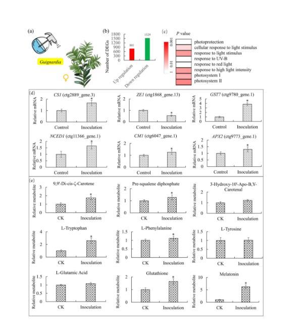 圖7展示了接種Guignardia孢子對宿主基因表達(dá)和代謝物積累的影響。a為將Guignardia菌株#1的孢子噴灑到雌性T.mairei樹枝上的實驗示意圖。b為Guignardia菌株#1孢子感染后上調(diào)和下調(diào)基因的數(shù)量。d為Guignardia相關(guān)的UV-B響應(yīng)基因的表達(dá)分析,“”表示顯著性P<0.01。e為若干關(guān)鍵代謝物的積累分析。